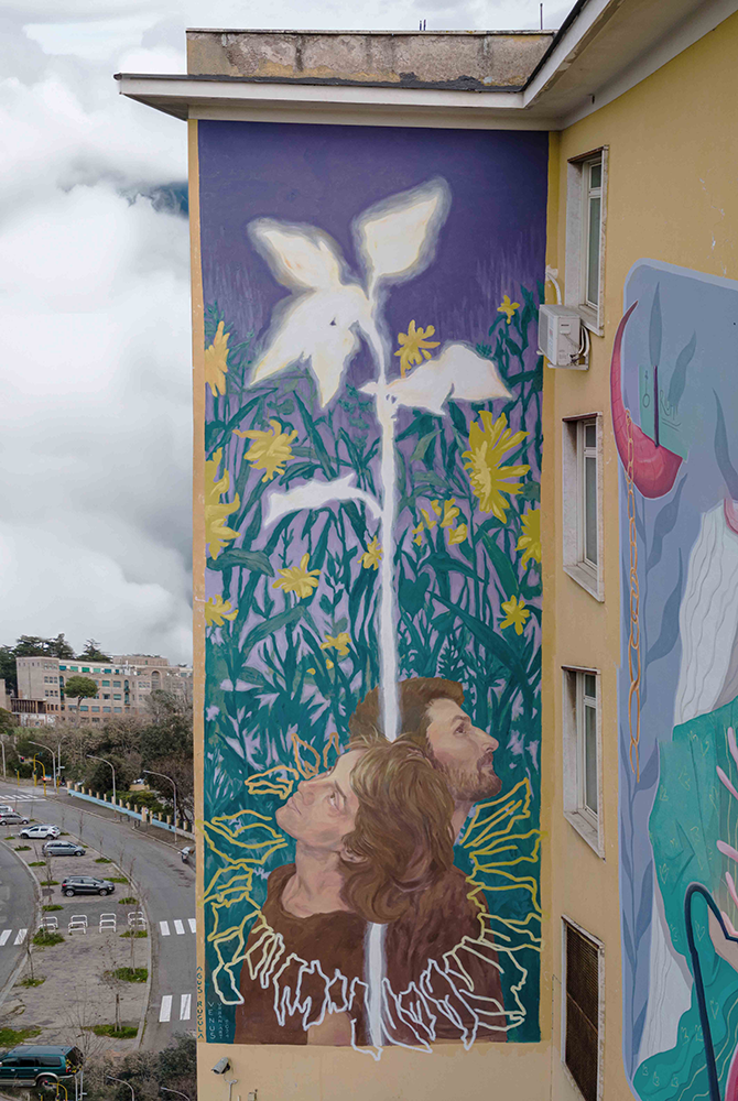 La concezione del murale trae origine da una fotografia realizzata dall’artista, in cui due figure umane compaiono schiena contro schiena. Questa posa esprime un atto di fiducia reciproca e diventa simbolo della profonda connessione che le unisce. Al centro della composizione, una pianta rigogliosa si erge come elemento protettivo e luminoso, avvolgendo le figure con la sua energia vitale. Secondo Agus Rucula, il lavoro di squadra rappresenta la via privilegiata per esprimere al massimo il potenziale individuale. L’artista sottolinea infatti come “la decisione di essere parte attiva del processo delle altre persone favorisca la fioritura”, richiamando un’idea di crescita condivisa che si riflette nell’opera stessa.