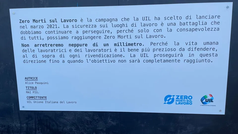 Il 17 ottobre 2023, a Roma, presso l’Ex Fiera di Roma su Via Cristoforo Colombo è stato inaugurato il murales della street artist di fama internazionale Alice Pasquini, sulla campagna Zero Morti sul Lavoro.